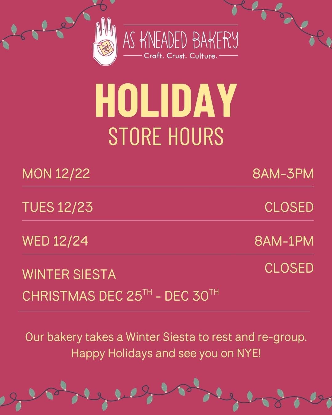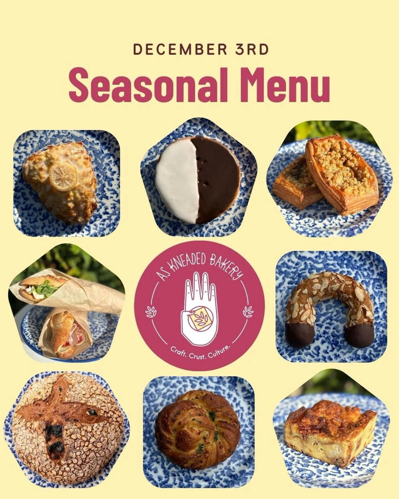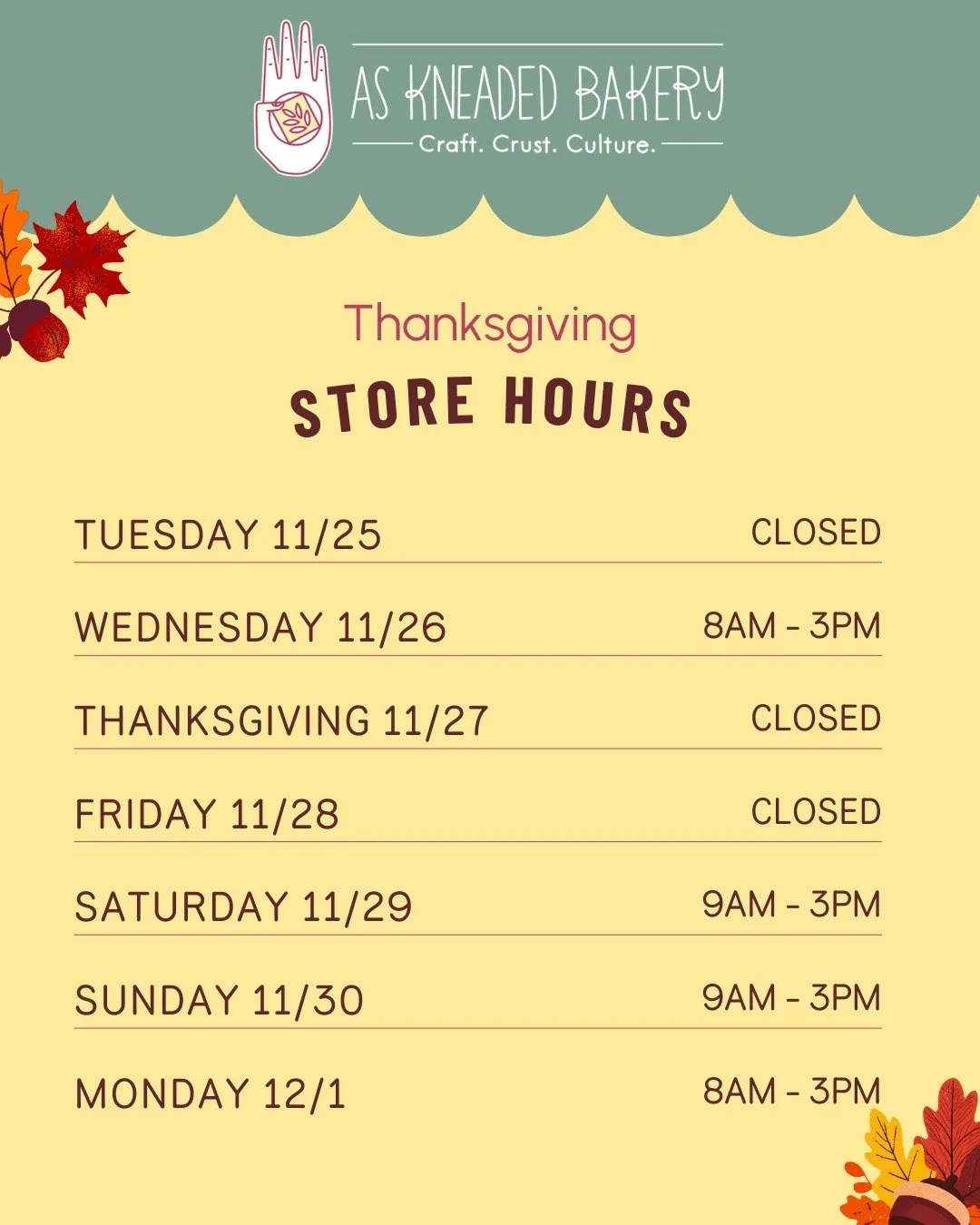 As Kneaded Bakery specializes in naturally leavened sourdough loaves, classic French baguettes, and challah. We also offer a range of noshes (Yiddish for "snacks"), which highlight a variety of doughs, both sweet and savory, from cultures around the world.