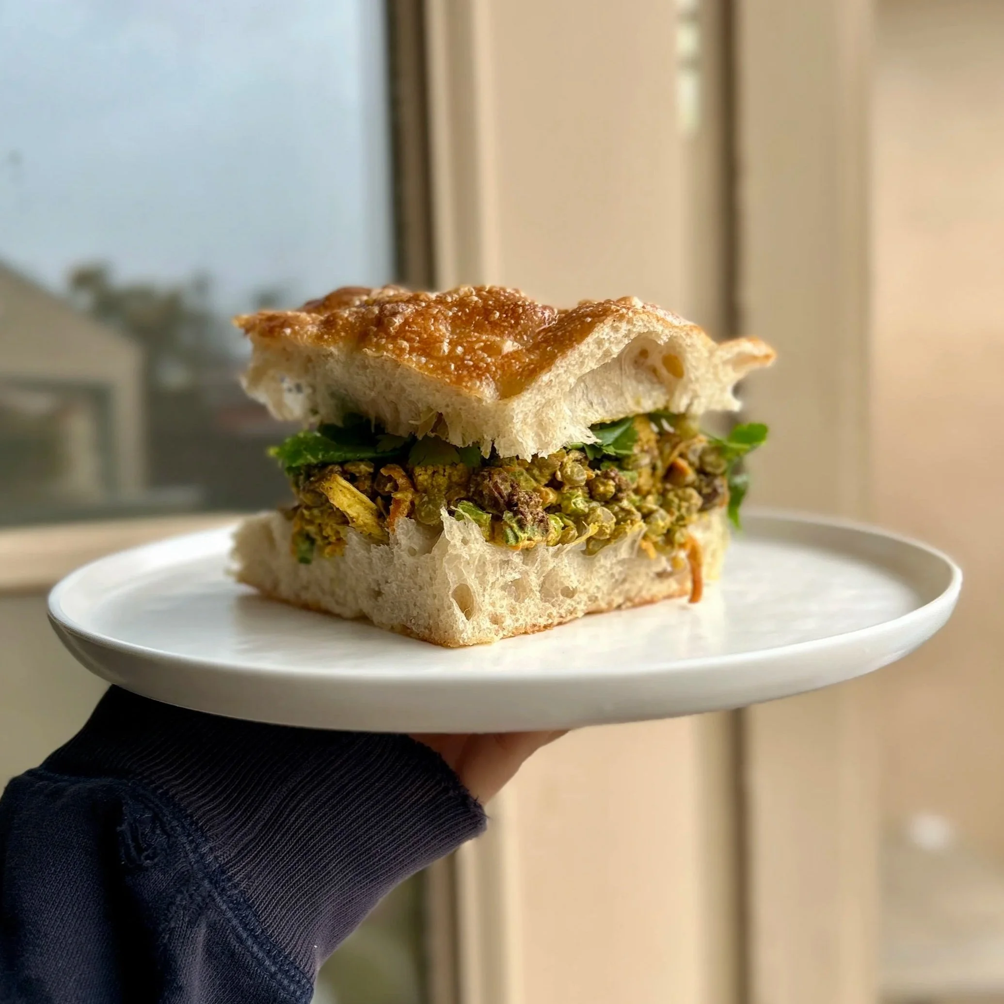 A vegan sandwich with a curried cauliflower salad, containing warm spices, hearty lentils, roasted cauliflower, shredded carrots, and spicy jalapeños. Served on our focaccia bread. Available at AKB only.