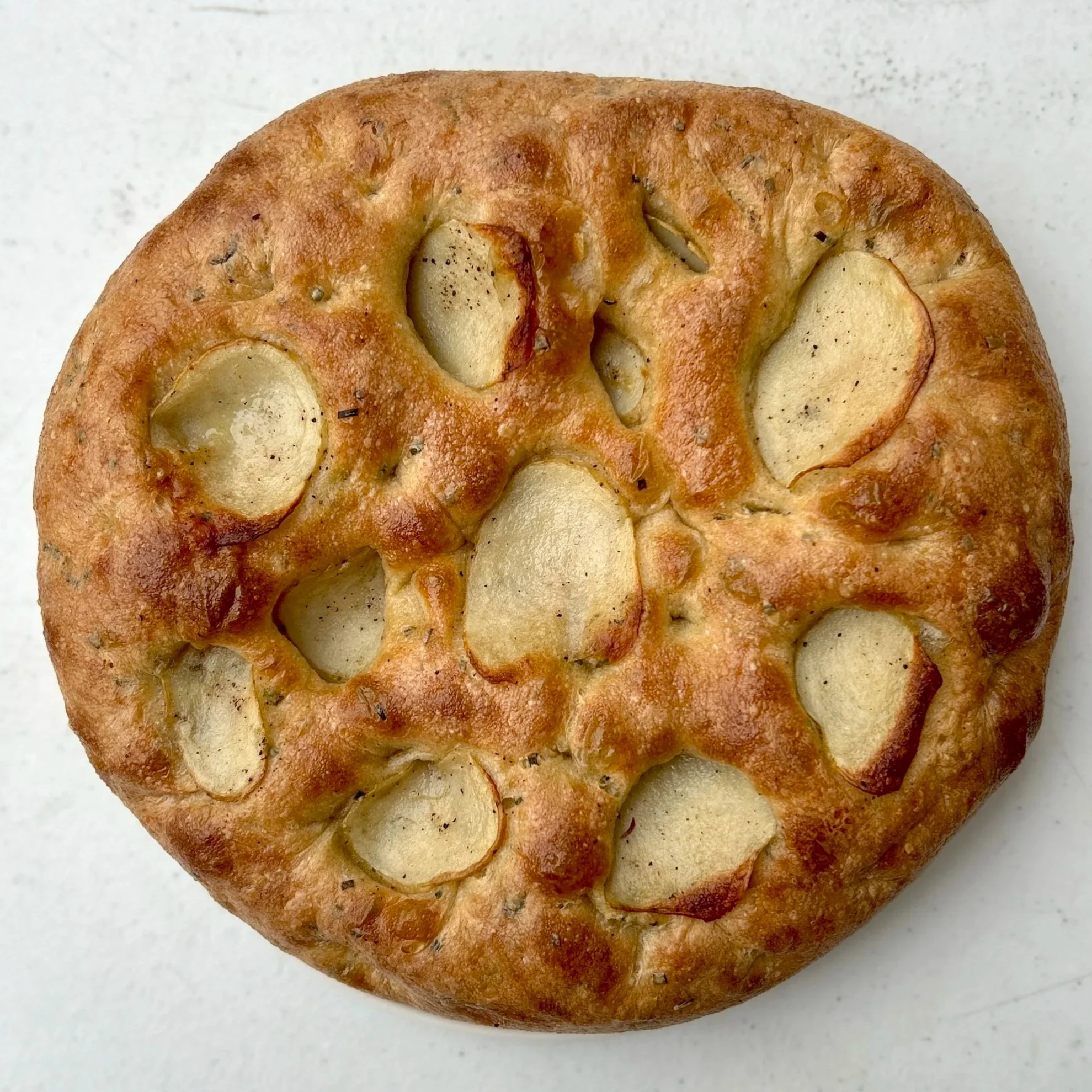 A layer of thinly sliced, tender potatoes is complimented by bright, oniony chives in this focaccia dough. Available everyday except Mondays.