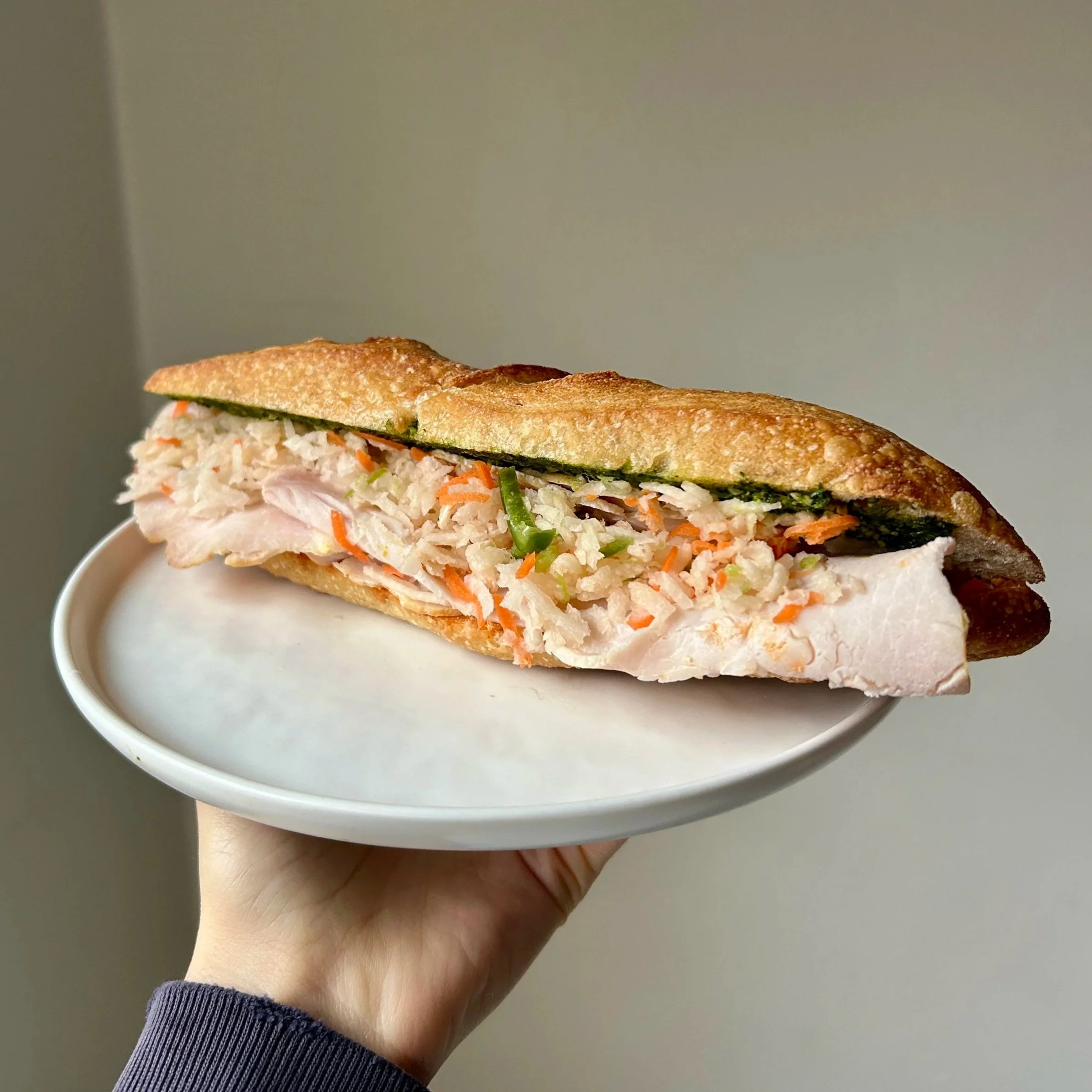 A Southwestern inspired turkey sandwich with a smokey chipotle sauce, bright cilantro spread, and crunchy jicama slaw. Served on our demi-baguette. Available at AKB only.